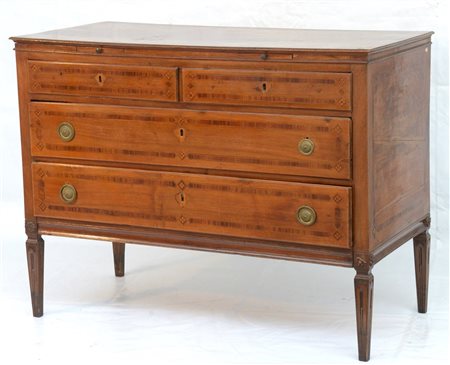 Comò in noce filettato e intarsiato a motivo geometrico. Due cassetti grandi più due in linea sottopiano; quattro piedi rastremati e scanalati, secolo XVIII (cm 123x94x57) (difetti e restauri)