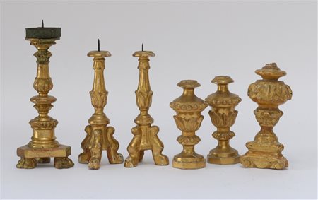 Lotto composto da tre piccoli candelieri e tre elementi decorativi in legno intagliato e dorato, secolo XVIII, misure diverse (h cm max 25) (difetti)