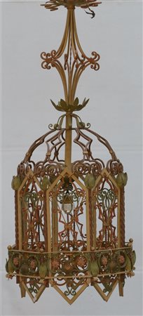 Lampadario da portico ottagonale in ferro battuto e dipinto con decoro a volute (cm 97 ca.) (lievi difetti)