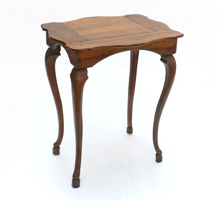 Tavolino in noce con piano sagomato, gambe mosse terminanti a piedi caprini. Secolo XVIII (cm 60x68x42) (difetti e restauri)