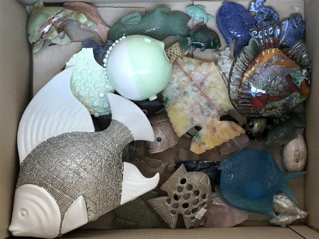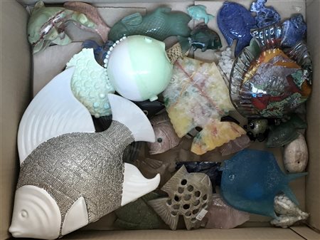Collezione di sculture a forma di pesce in vetro, pietra dura e ceramica (difetti)