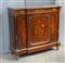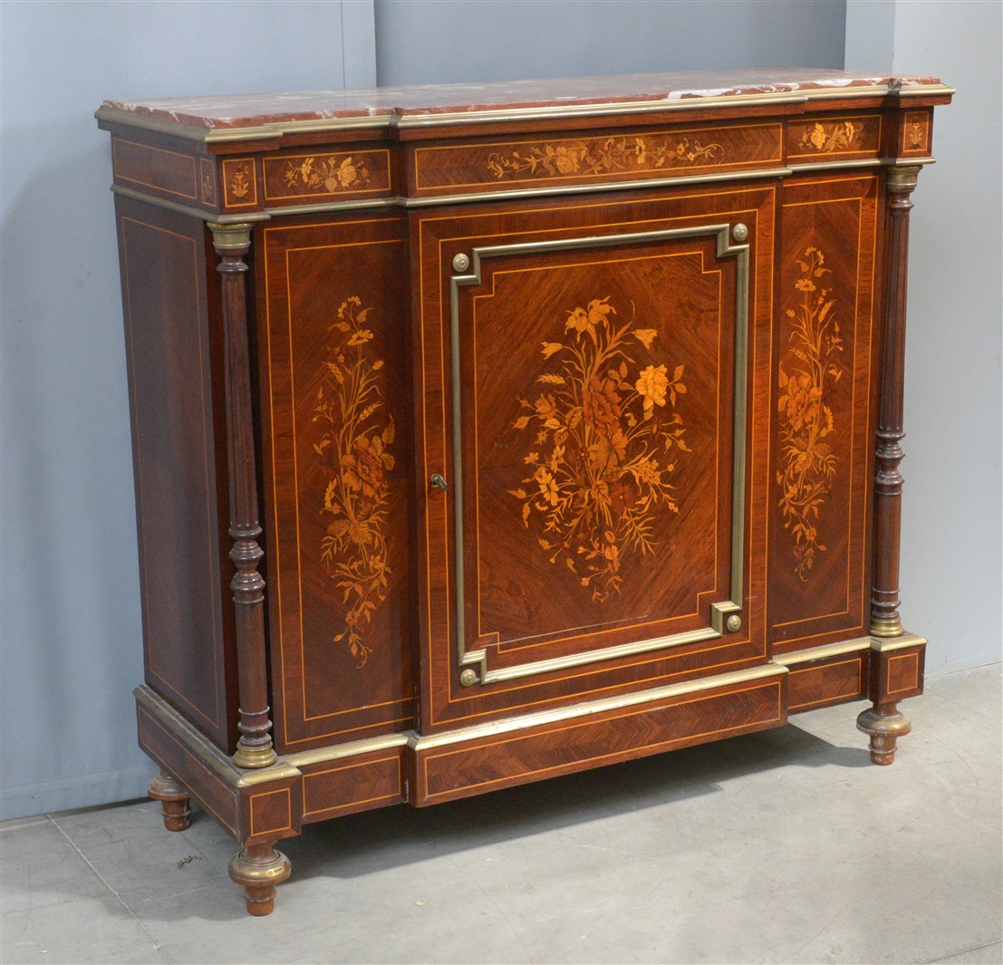 Credenza a uno sportello interamente lastronata, filettata e intarsiata in legni vari a mazzi di fiori. Montanti a colonne tornite e scanalate, profili in ottone. Piano in marmo rosso venato. Secolo XIX (cm 120x110x44) (difetti e mancanze)