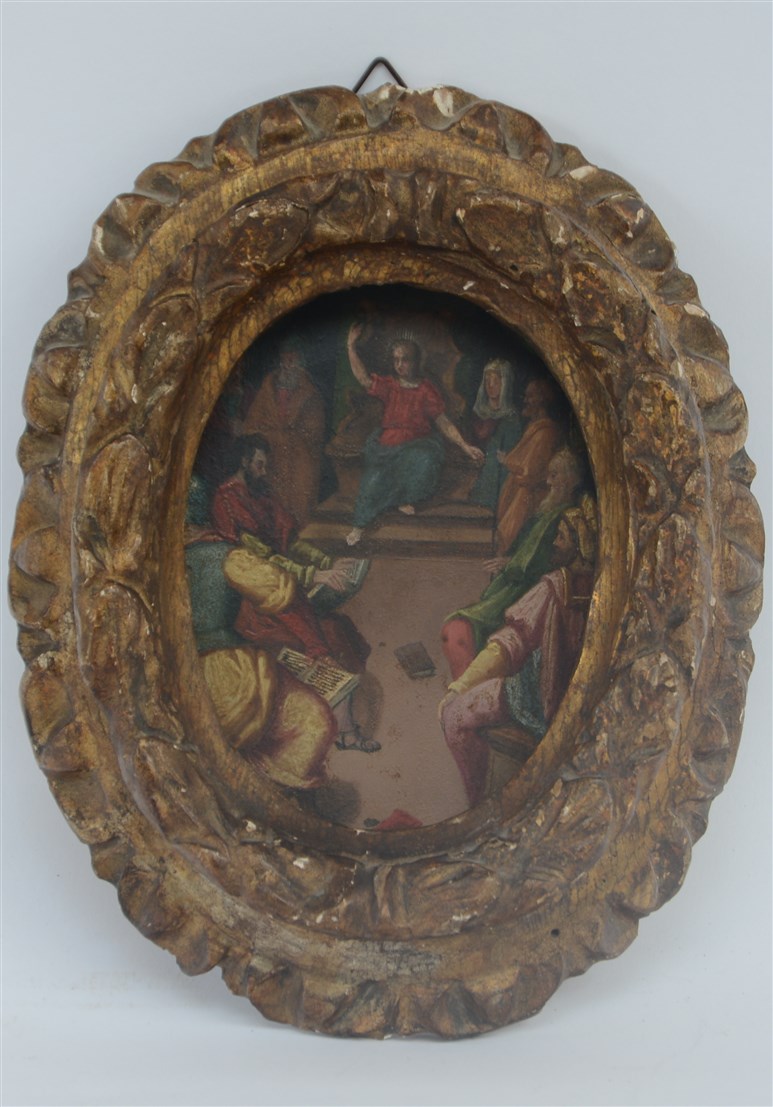 Scuola del secolo XVIII "Gesù tra i Dottori" olio su rame ovale (cm 13x10) in cornice in legno dorato (difetti)