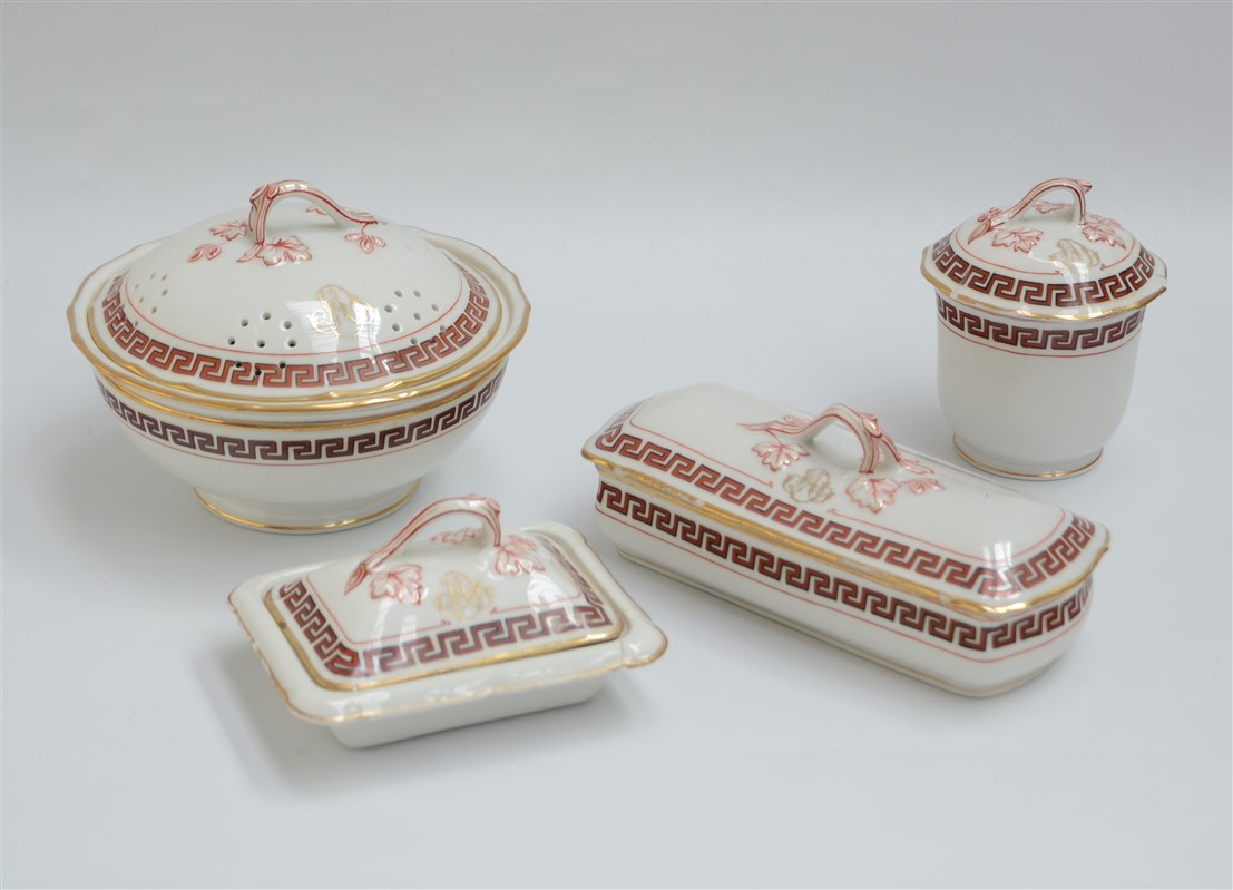 Manifattura francese, gruppo di quattro contenitori con coperchio in porcellana decorati a greche e rami fogliati, recanti monogramma AD (difetti)