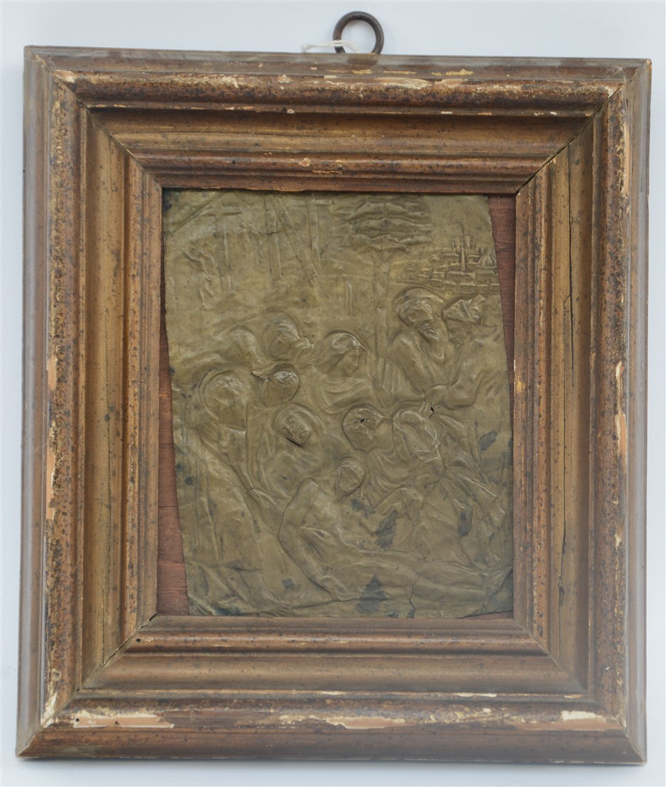 Ignoto "Deposizione" antica placca in rame sbalzato (cm 18x15,5) In cornice (mancanze)