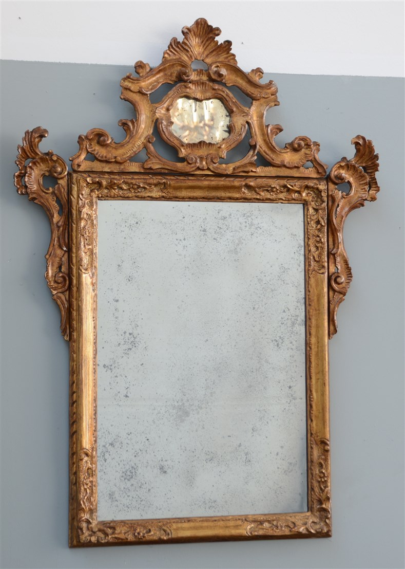 Specchio in legno intagliato e dorato con cimasa scolpita e traforata (cm 110x72) (difetti)