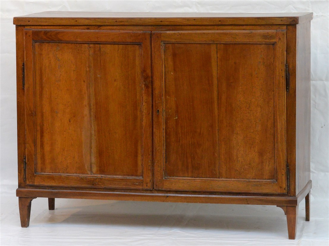 Antica credenza in noce a due ante riquadrate e due cassetti interni. Piano con