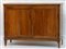 Antica credenza in noce a due ante riquadrate e due cassetti interni. Piano con rosone centrale intarsiato e piedi rastremati (cm 137x102x46) (difetti)