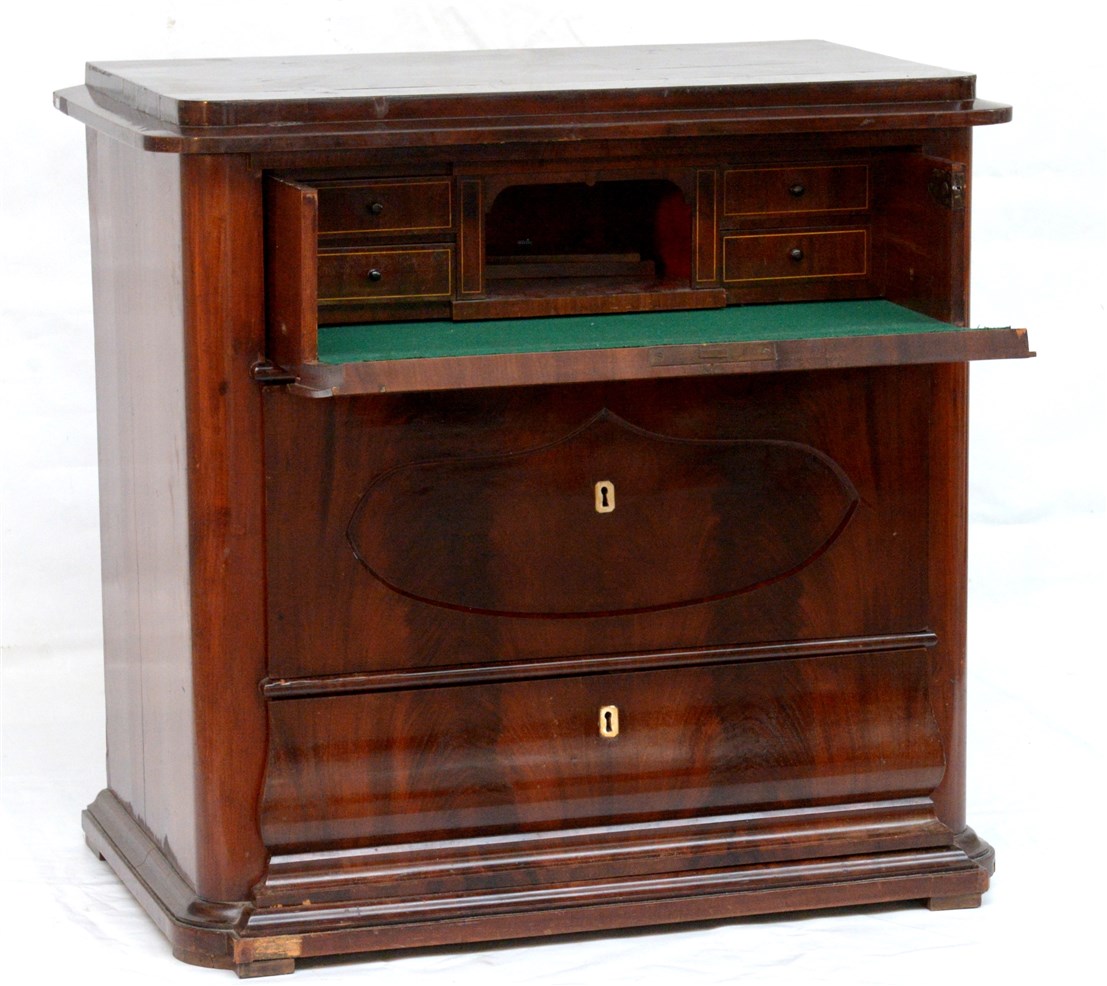 Comò in mogano e piuma di mogano, a tre cassetti di cui il primo celante piano scrittoio rivestito in panno. Bocchette in osso. Nord Europa, secolo XIX (cm 94x89x58) (difetti)