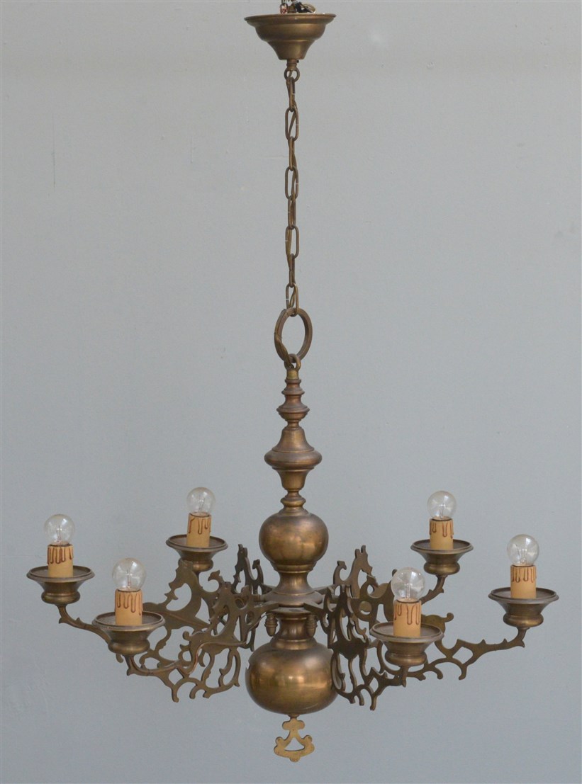 Lotto 3840 | Lampadario "olandese" a sei luci in bronzo con bracci traforati e fusto tornito