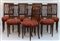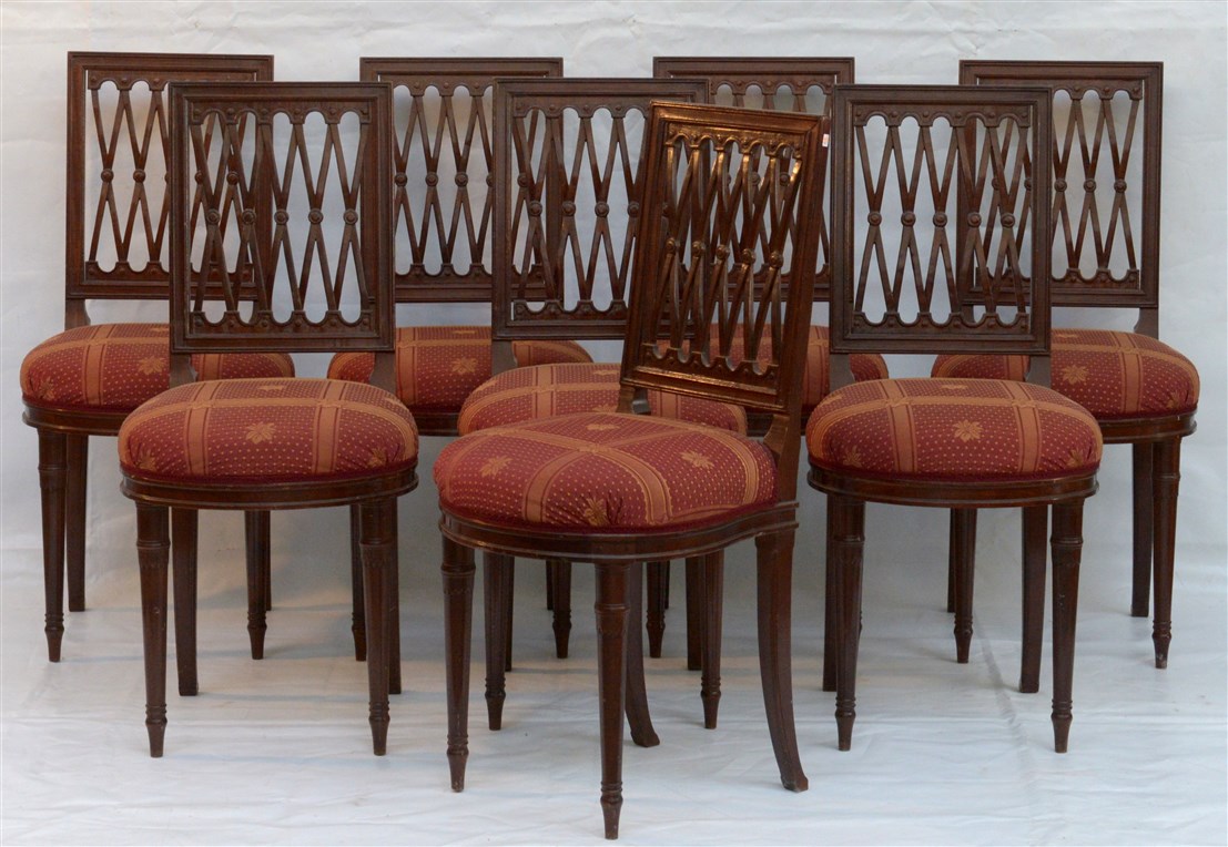 Gruppo di otto sedie in mogano con schienale a giorno a listelli incrociati, ga