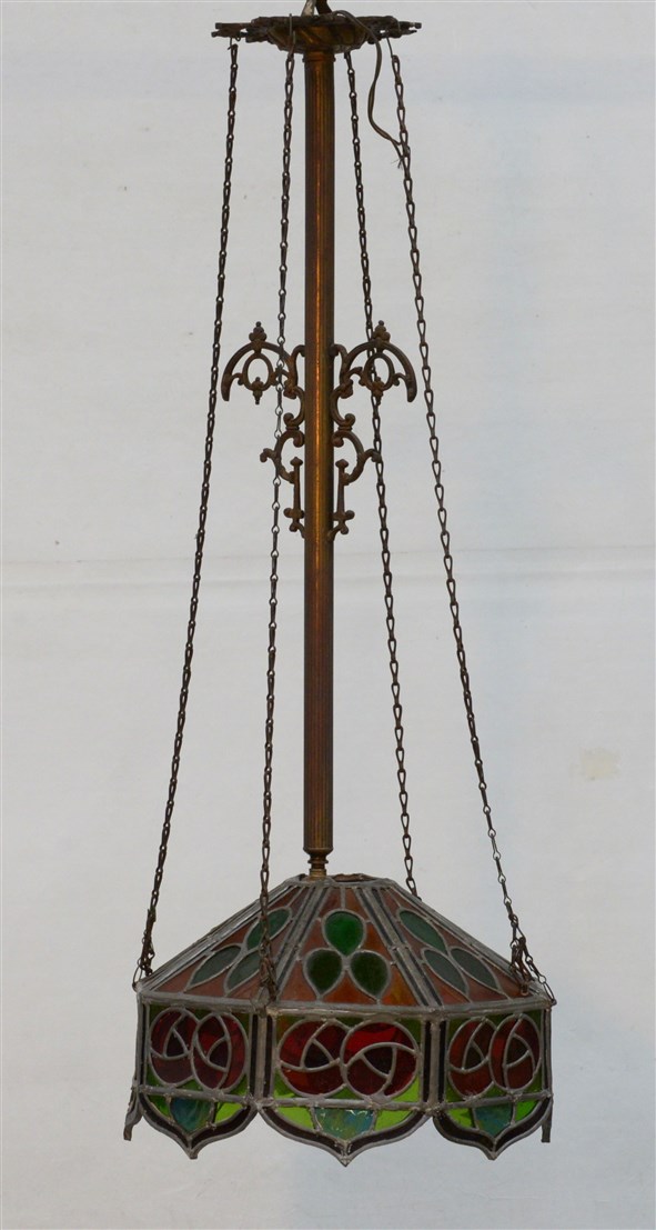 Lampada a sospensione ad una luce con fusto in bronzo e paralume ottagonale a vetri policromi legati a piombo (h. cm 78/ d. cm 32) (difetti)