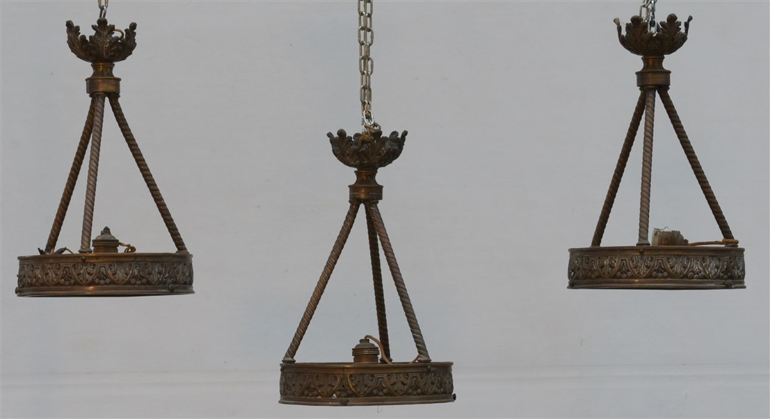 Gruppo di tre lampade a sospensione in metallo ad una luce con fascia decorata a foglie stilizzate, mancanti dei paralumi (h cm 38) (difetti e mancanze)
