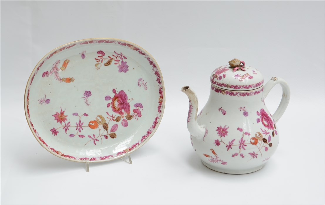 Manifattura del secolo XVIII, teiera e vassoio da portata ovale in porcellana d