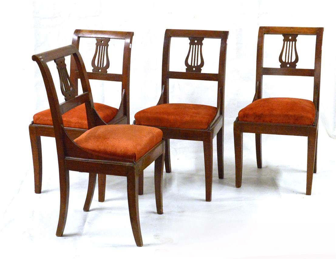 Gruppo di quattro sedie in noce con schienale a lira, secolo XIX (difetti)