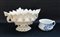 Lotto composto da un centrotavola biansato in ceramica decorato con foglie e rose e un pitale decorato con papaveri blu (difetti e restauri)