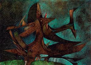 Gianni Dova Roma 1925 - Pisa 1991 Tre uccelli, 1968 Olio su tela, cm. 100,3x140,5 Firma in basso a destra: Dova G.; firma e titolo al verso sulla tela: Dova G. / "3 uccelli"; sul telaio: etichetta Gal- leria La Bussola Torino / Esposto alla mostra personale / di Gianni Dova / 19 aprile - 9 maggio 1969. Storia: Collezione privata, Torino; Collezione privata Esposizioni: Gianni Dova, Torino, Galleria La Bussola, 19 aprile - 9 maggio 1969, cat. n. 10, illustrato. Bibliografia: Franco Russoli, Gianni Dova, Prearo Edi- tore, Milano, 1975, p. n.n.