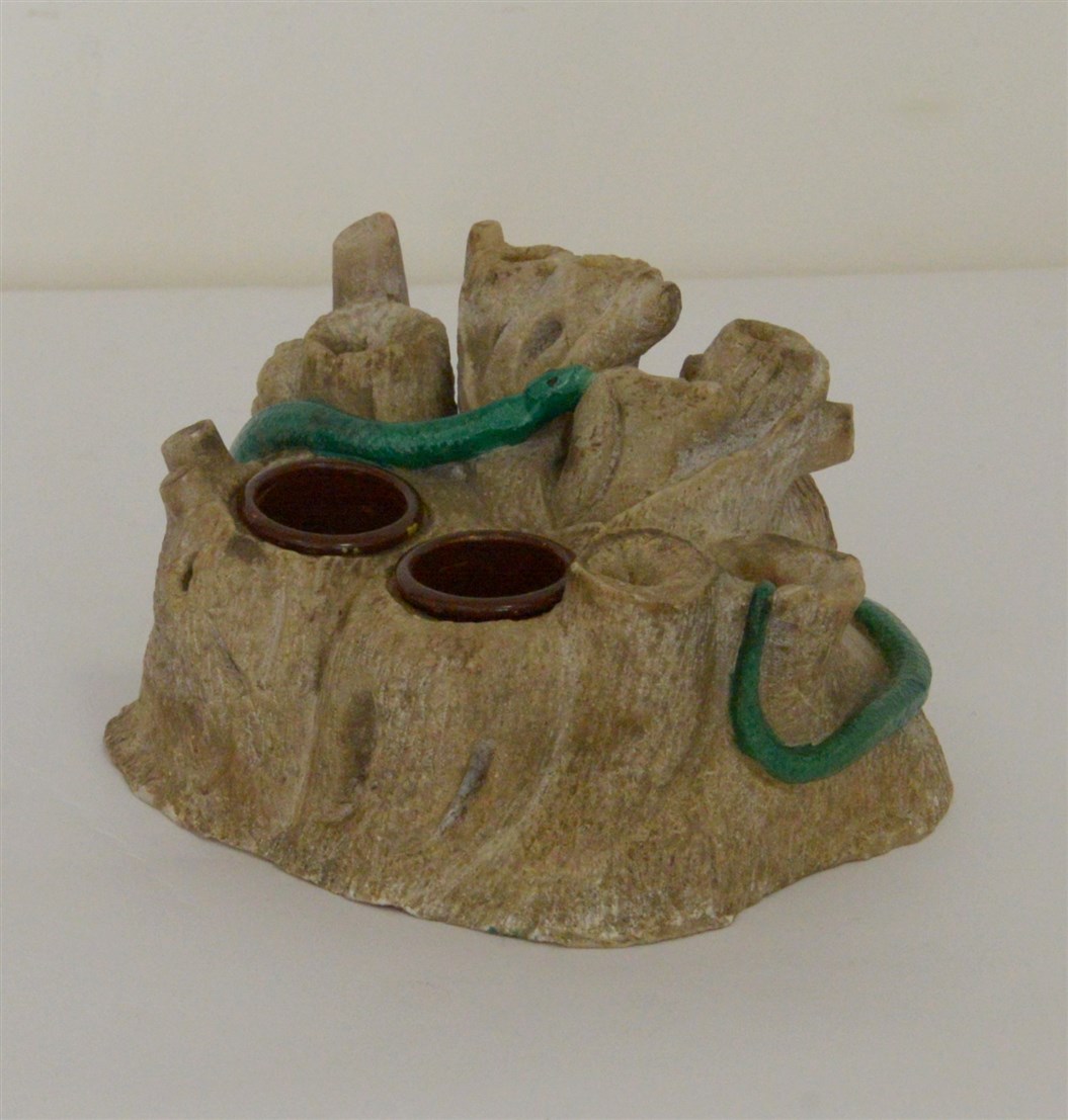 Calamaio in marmo a forma di roccia con serpente, boccette in metallo, secolo XIX (difetti)