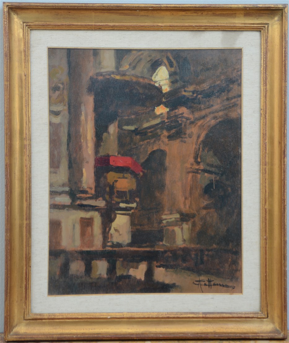 "Interno del Duomo di Milano" olio su compensato (cm 50x40) Firmato in basso a destra. In cornice