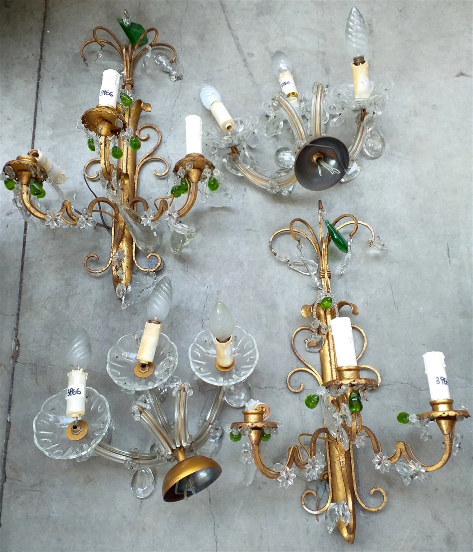 Lotto di due coppie di appliques a tre luci in metallo, vetro e pendenti in cri