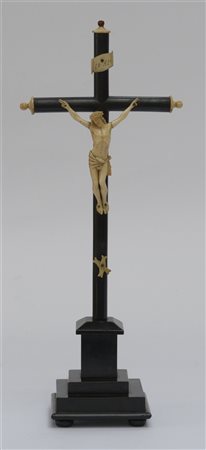 Arte del secolo XIX "Cristo crocifisso" scultura in avorio (h cm 11,5) montato su croce in legno ebanizzato (h totale cm 38) (difetti e mancanze)