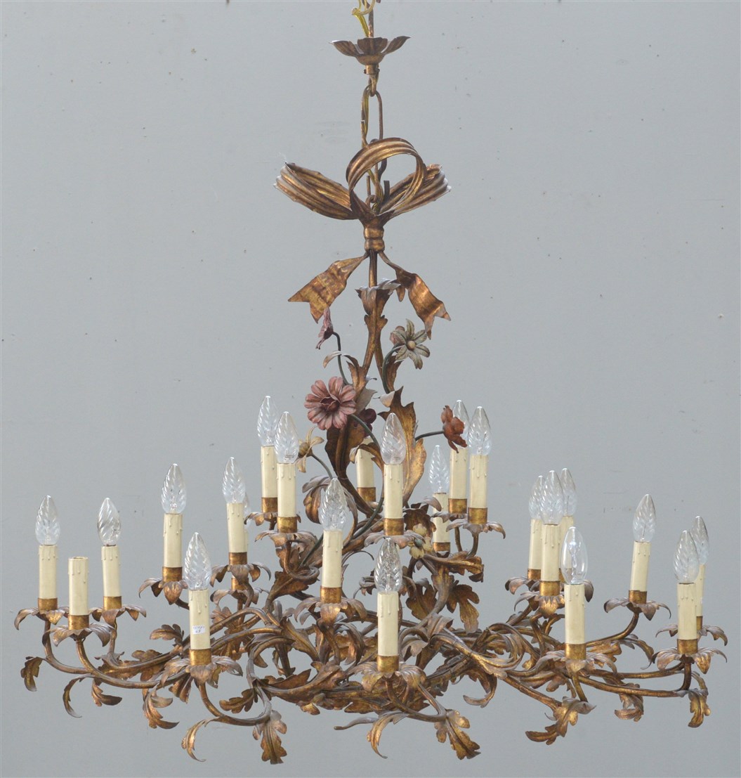 Lampadario a ventiquattro luci in metallo laccato in policromia e dorato a motivi vegetali, fiori e nastro (h cm 97) (difetti)