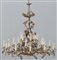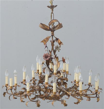 Lampadario a ventiquattro luci in metallo laccato in policromia e dorato a moti