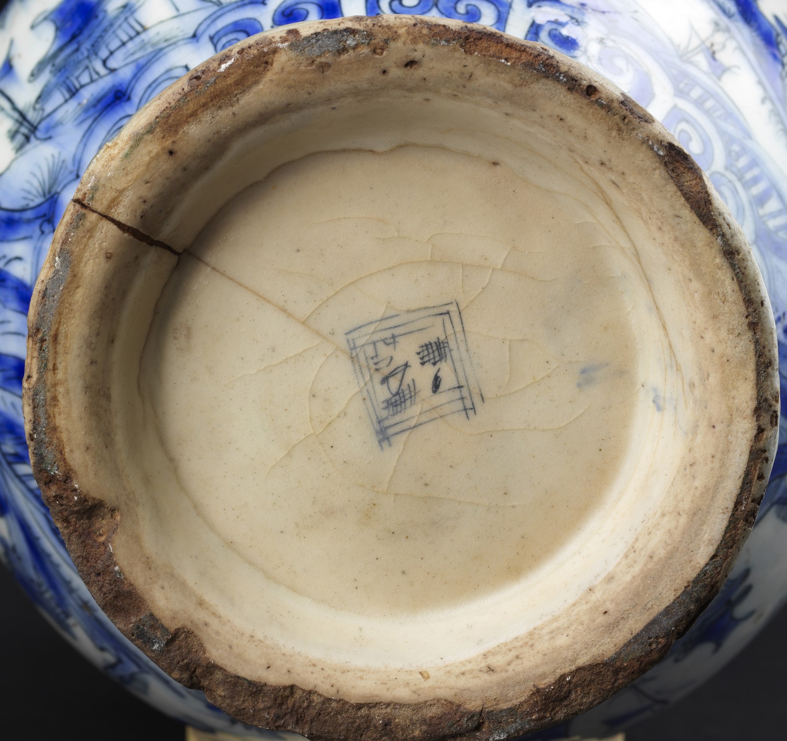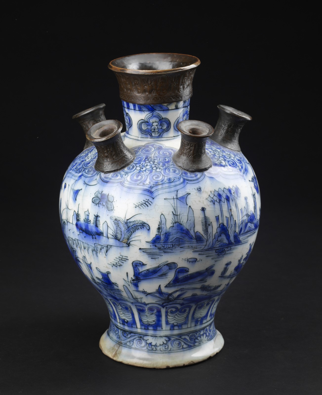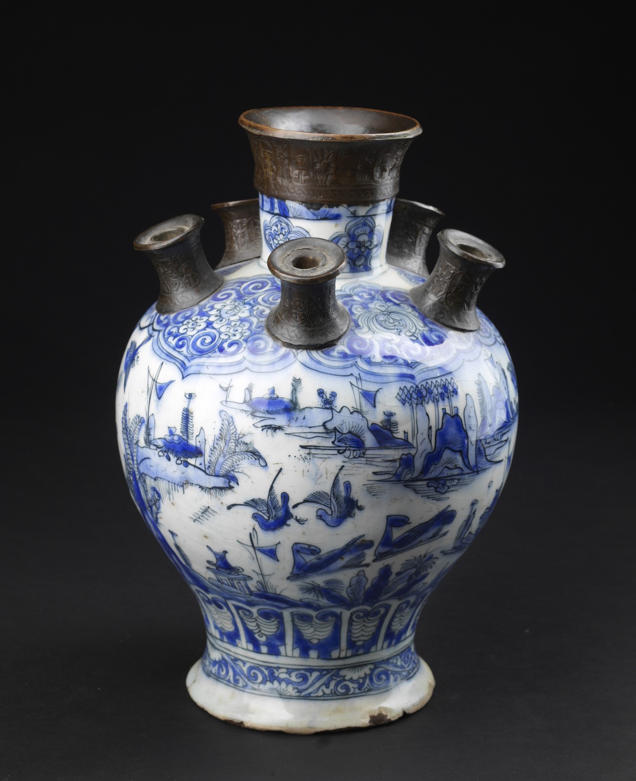 Islamic Art A large Safavid blue and white pottery tulip vase bearing a pseudo Chinese reign mark at the base Iran, 17th century . . Cm 24,00 x 33,00. chips and hairlines.