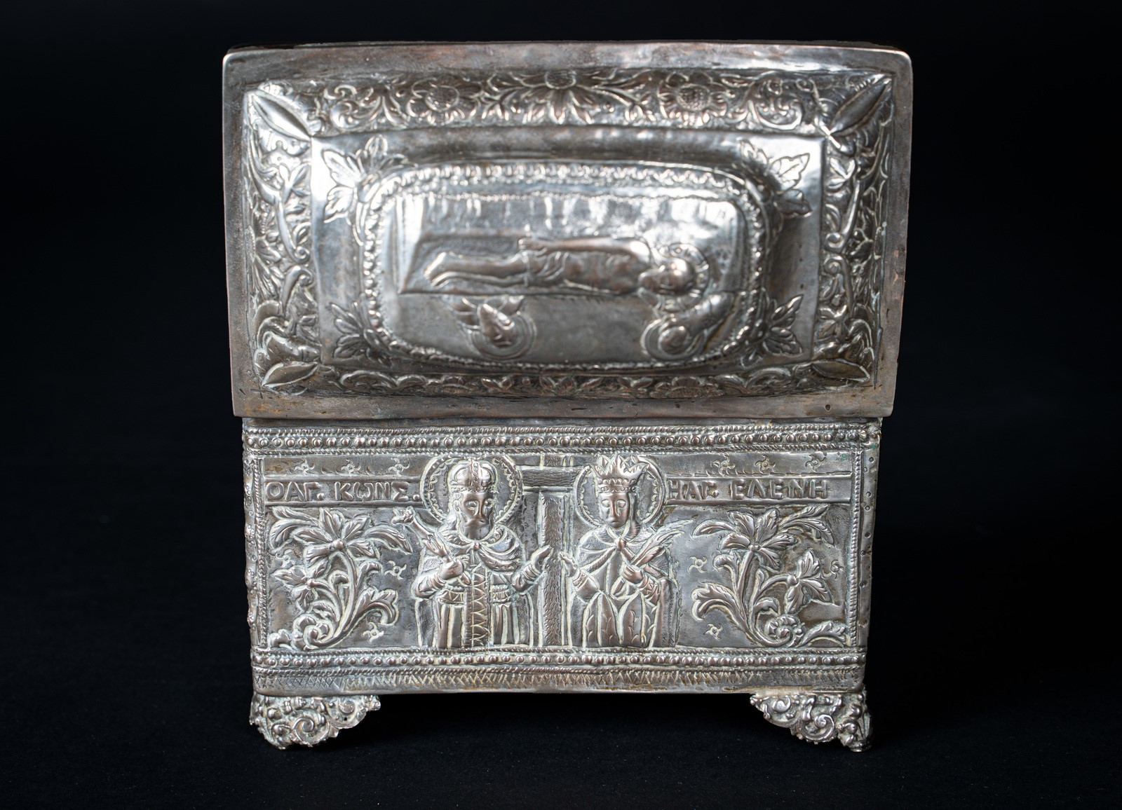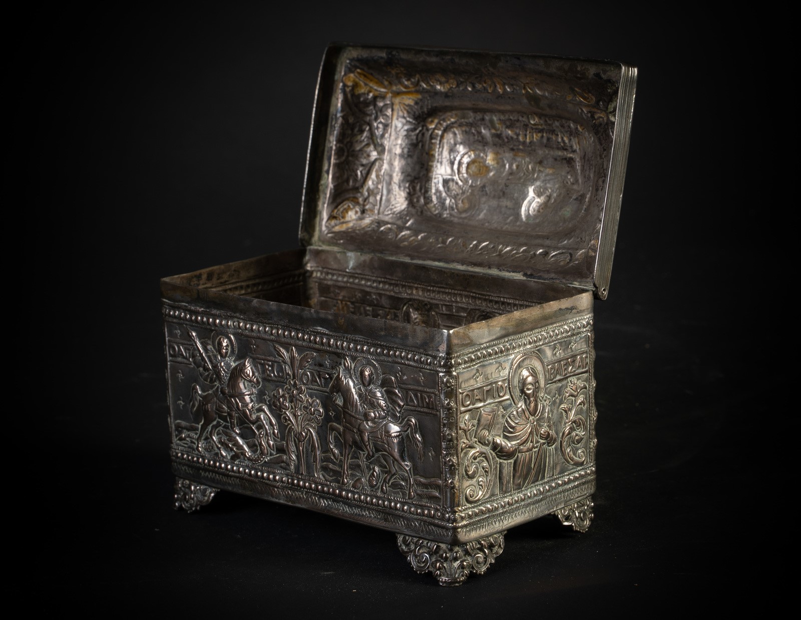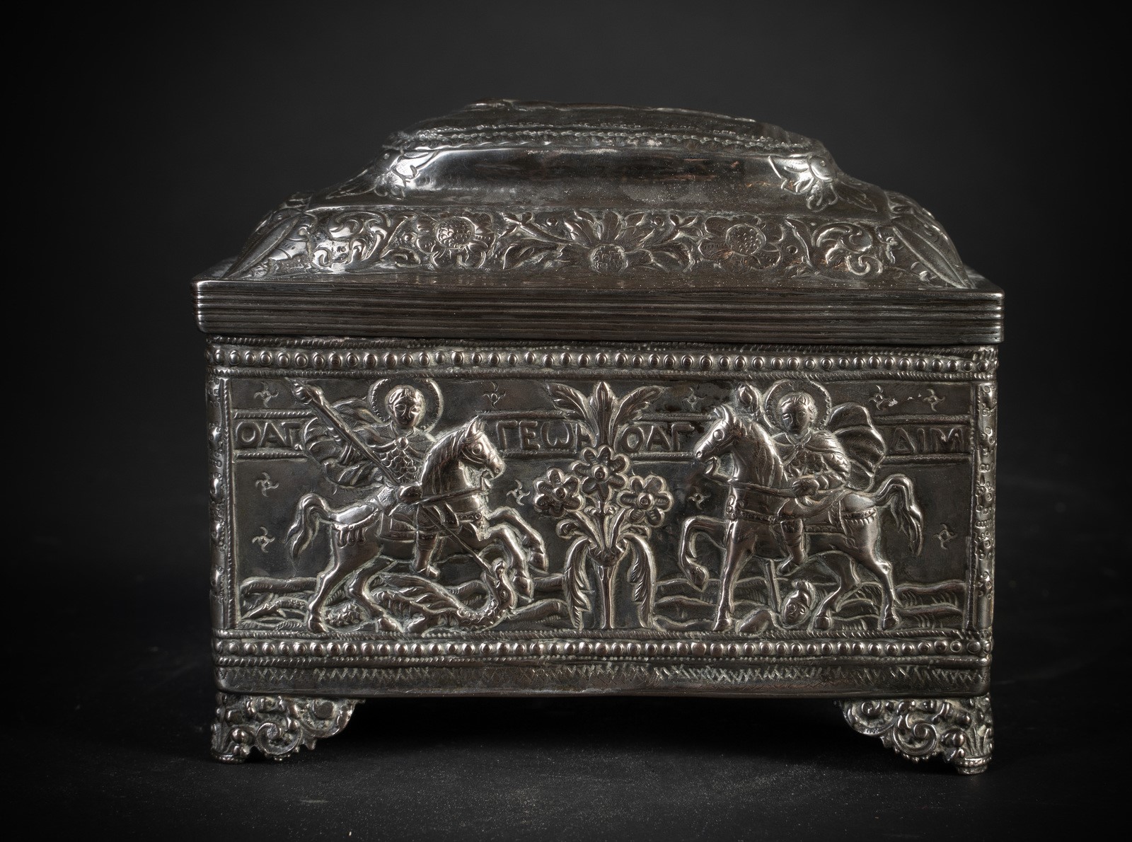 Arte Islamica An Ottoman silver box embossed with saints Greece, 18th-19th century.