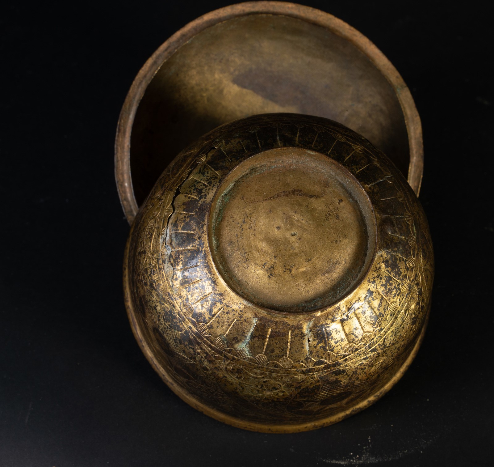 Islamic Art An Ottoman tombak lidded bowlTurkey, 17-18th century. . Cm 14,50 x 17,50. Damages at the base.