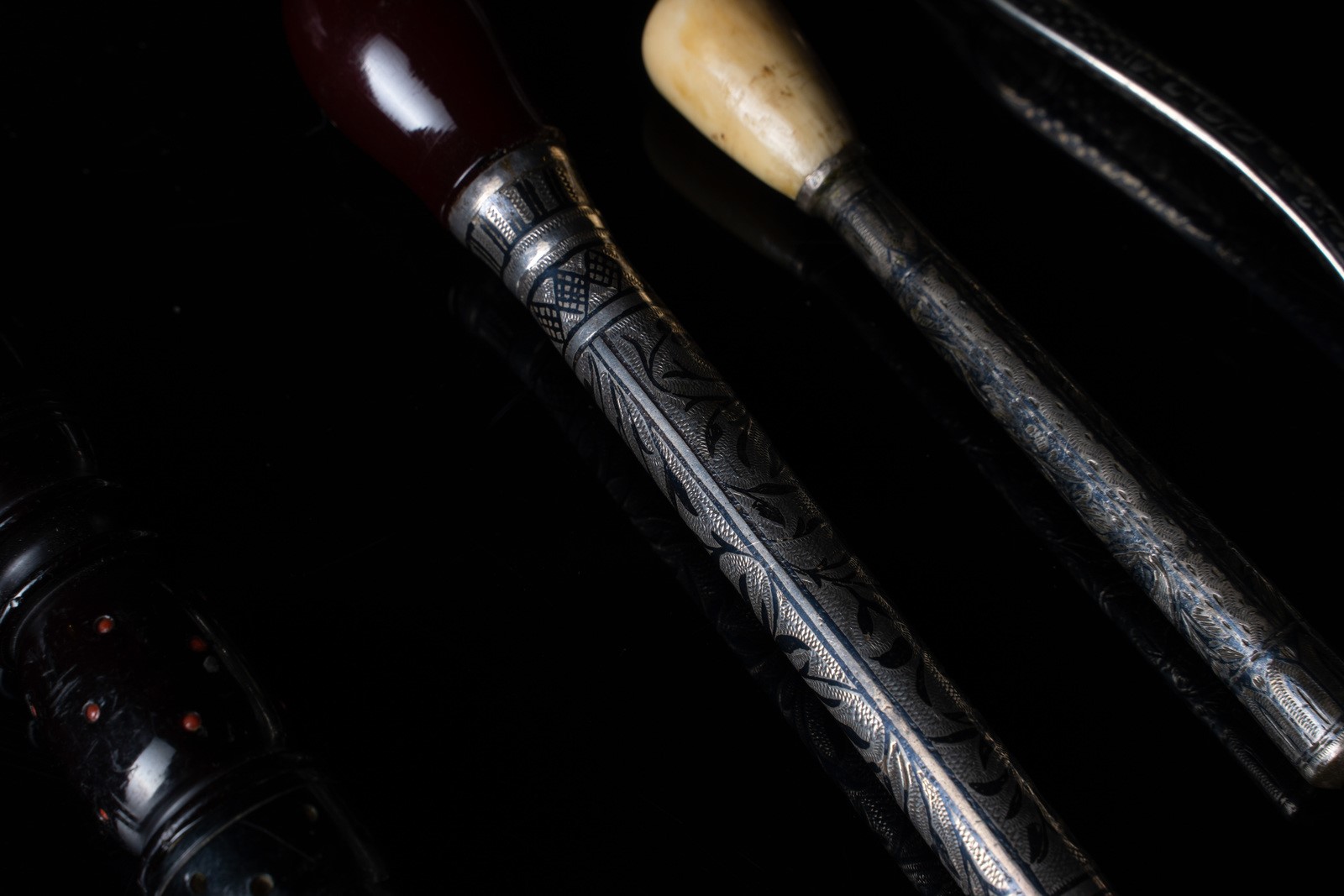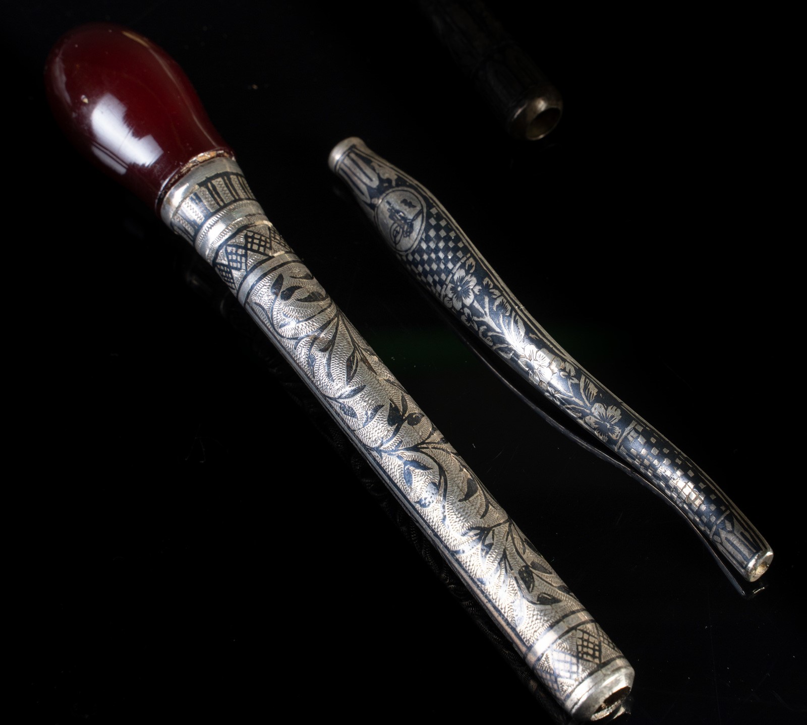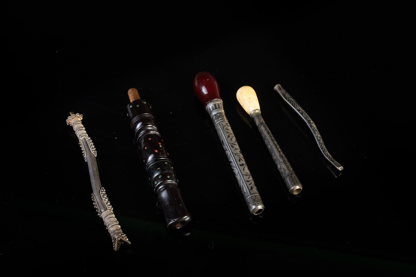 Arte Islamica A collection of five Ottoman mouth pieces with nielloed silver and/or amberTurkey, 19th century .