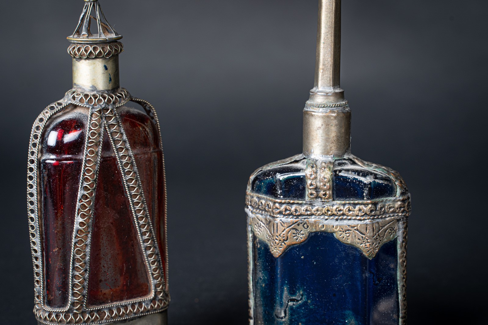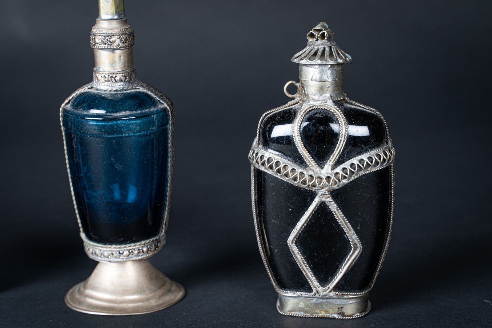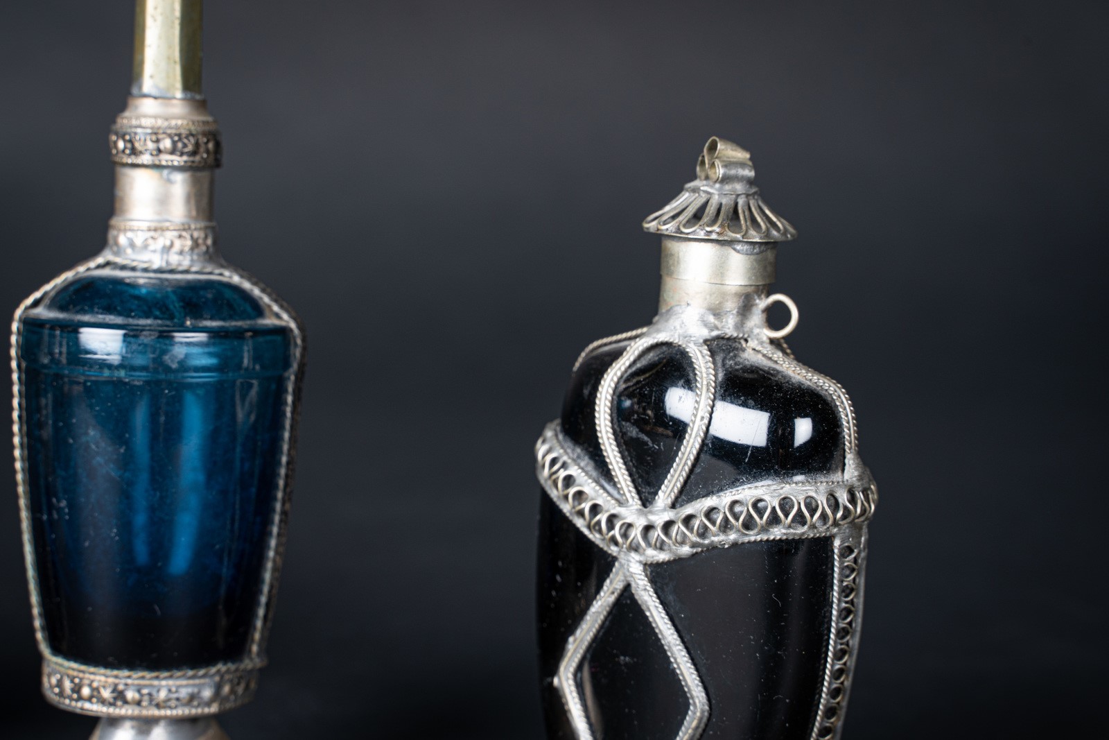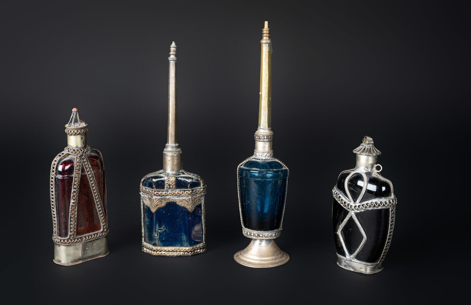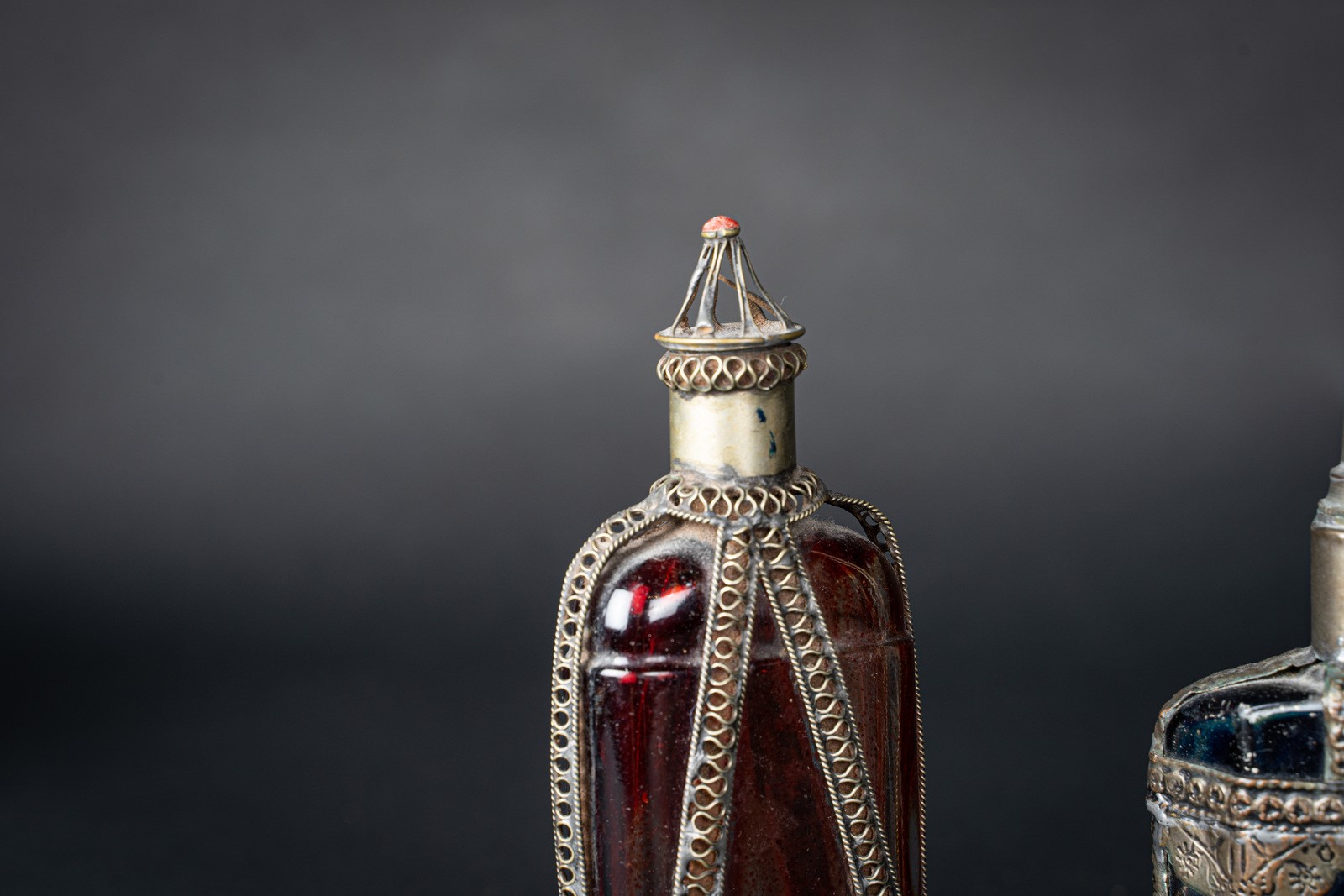 Arte Islamica A collection of four polychrome glass perfume bottles with silver mount Near East, 19th century .