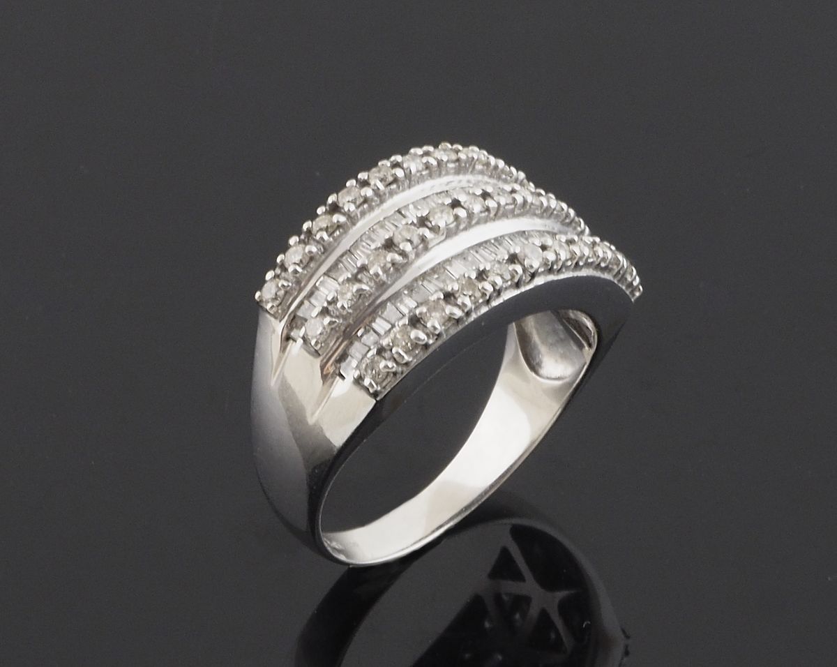 Anello in oro bianco a fascia con due linee di diamanti taglio baguette alternate a 3 linee di diamanti taglio brillante per tot ca 1,40 Misura 18