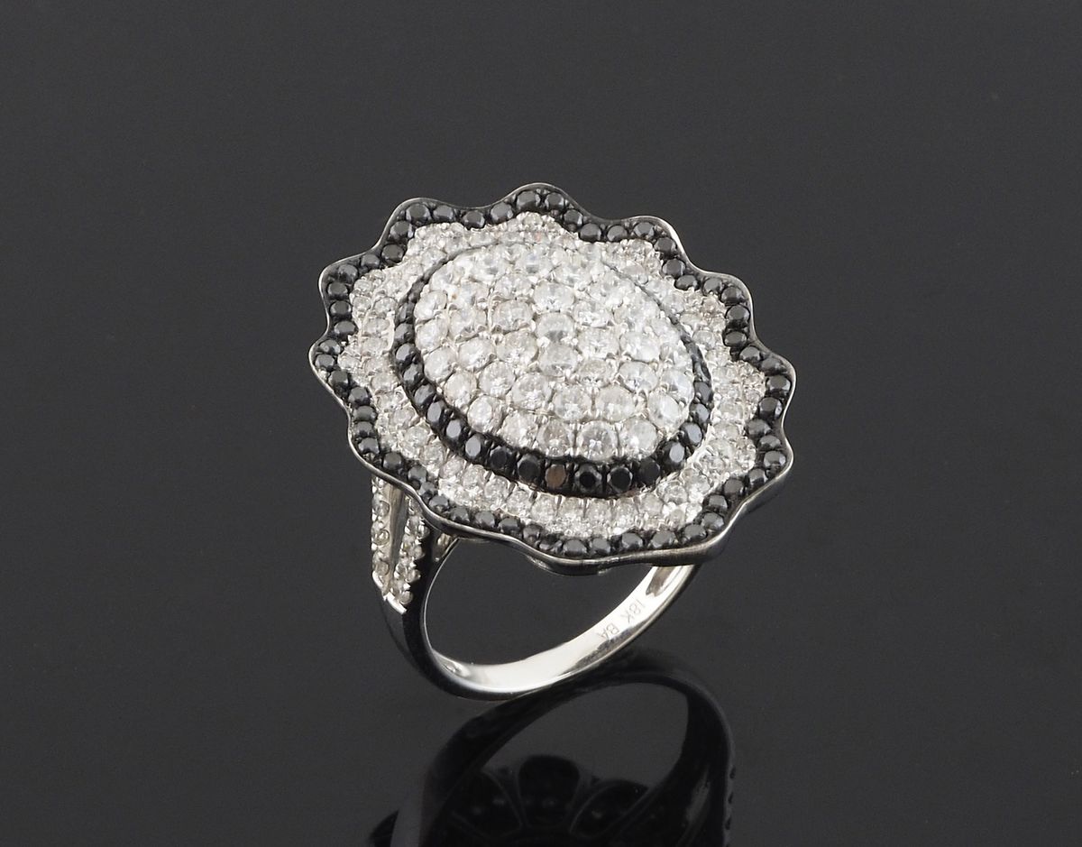 Anello in oro bianco a forma di fiore con diamanti bianchi e neri. Misura 15
