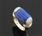 Anello in oro giallo a ponte con lapislazzulo inciso a losanghe, ai lati pavè di diamanti. Misura 14