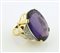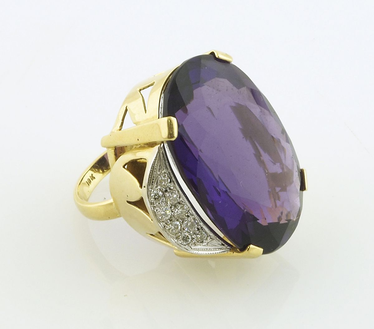 Anello in oro giallo con grande ametista centrale di forma ovale, ai lati pavè di diamanti, montatura a traforo. Misura 18