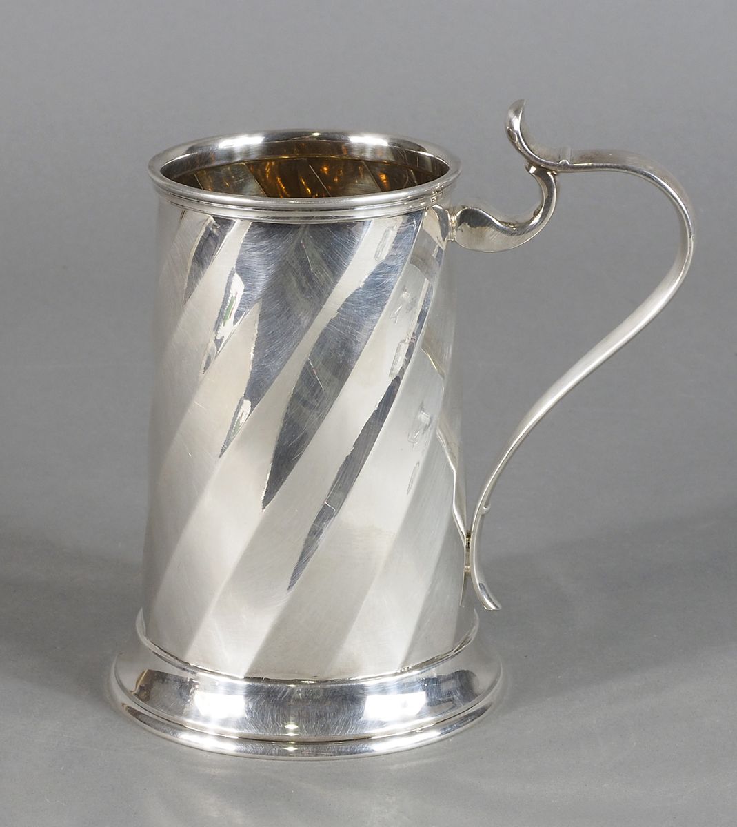 Boccale in argento lavorato a torciglione con grande manico, interno dorato.16. gr. 380.