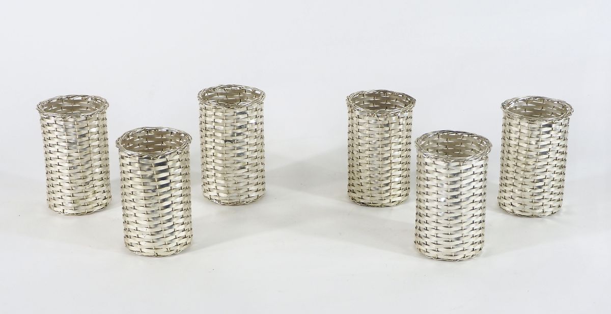 Lotto di 6 portabicchieri in argento lavorati ad intreccio. gr. 585.