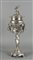 Grande alzata Liberty in argento con al centro figura femminile che sorregge una coppa con coperchio alla cui sommità un putto seduto porge dei fiori e decori a motivi floreali e intrecci. Germania, inizio XX secolo. H. cm. 57. gr. 2700.