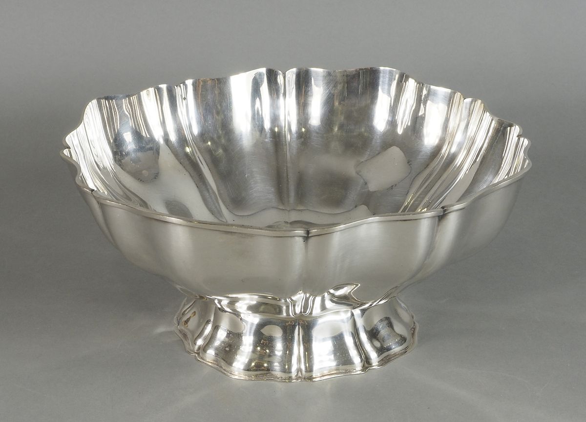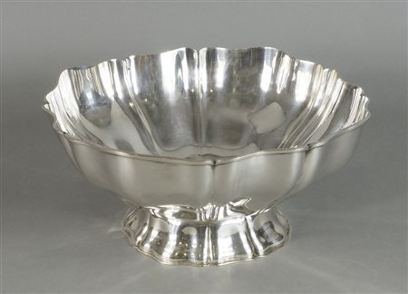 Centrotavola rotondo in argento lavorato a coste verticali. H. cm. 13, diam. cm. 29. gr. 810.