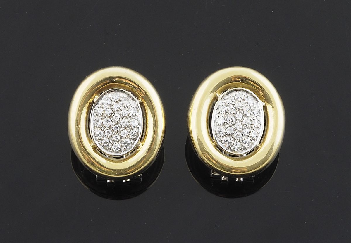 Orecchini in oro giallo e bianco di forma ovale con al centro pavè di diamanti taglio huit huit, chiusura con perno e clip