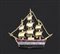 Piccola spilla in oro giallo raffigurante veliero, parte inferiore rubini diamanti e zaffiri, h cm 3