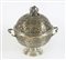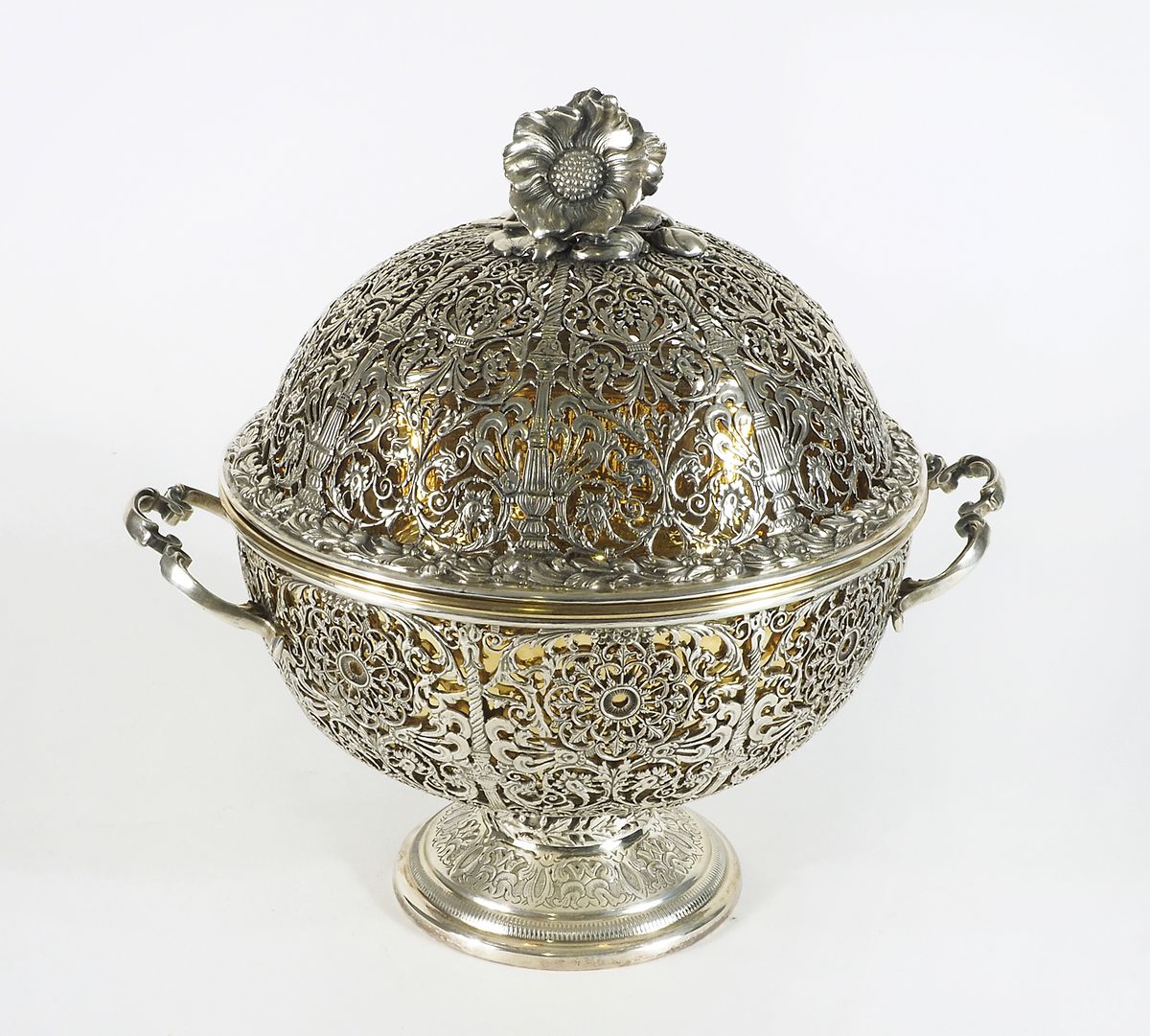 Centrotavola a forma di palla in argento finemente trafoato, con manici laterali, fiori sulla parte superiore. Milano, ditta Messulam Enrico. H. cm. 30. gr. 2200.