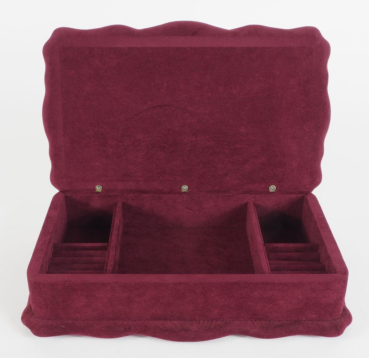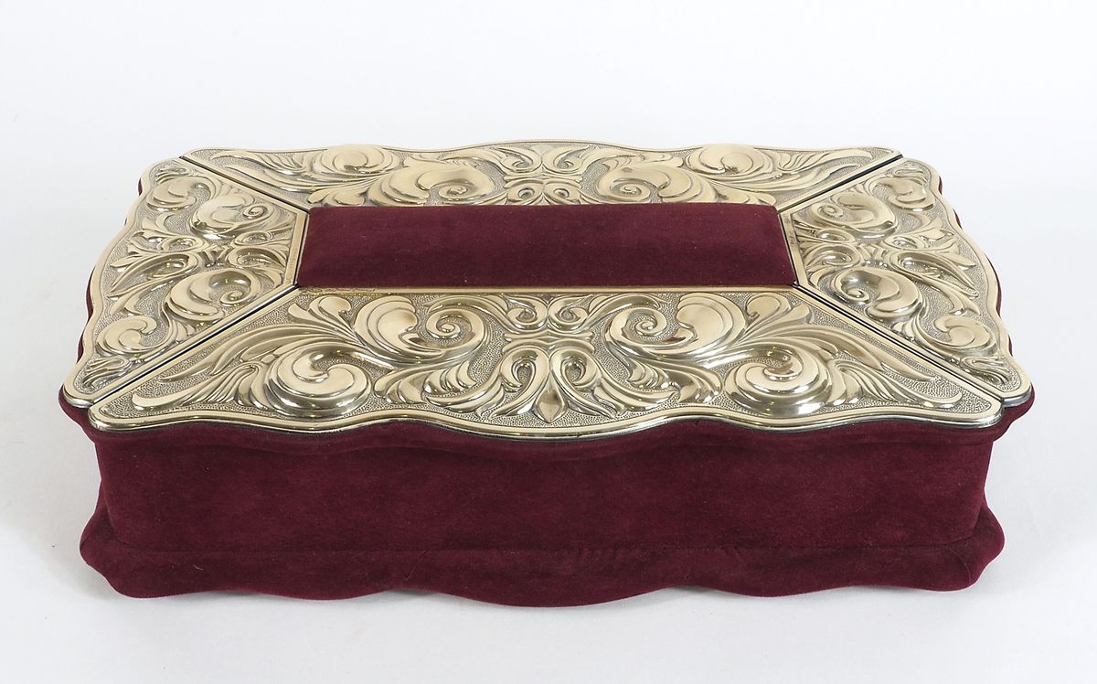Grande scatola portagioie rivestita in velluto rosso con coperchio composto da 4 placche in argento sbalzato. cm. 9x35x22.