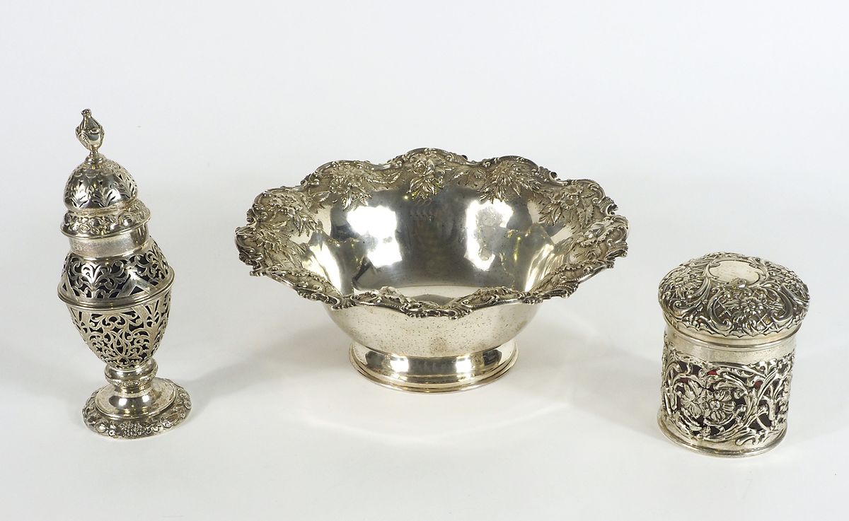 Lotto di 3 oggetti in argento tra cui ciotola, contenitori in vetro.