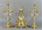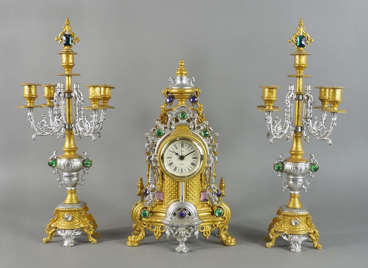 Trittico "fantasia" composto da orologio da tavolo e paio di candelieri a 5 luci. H. max cm. 48.