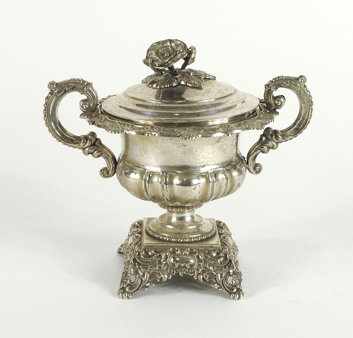 Zuccheriera in argento con manici laterali e fiore sul coperchio. Lombardo Veneto Milano. H. cm. 18. gr. 350.