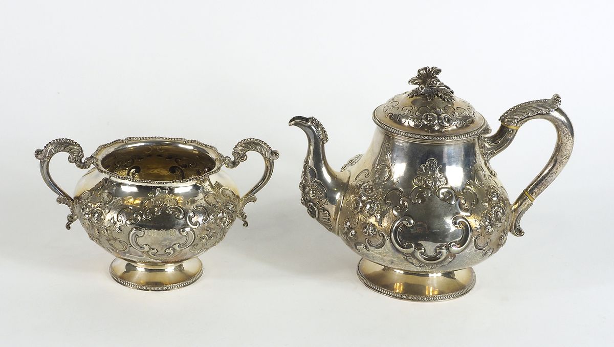 Teiera e zuccheriera in argento 925 lavorate a sbalzo con manici. Londra 1864. gr. 1150.
