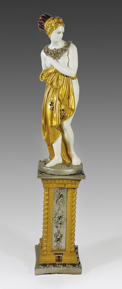 Scultura "fantasia" raffigurante figura femminile su base. H. tot cm. 140.