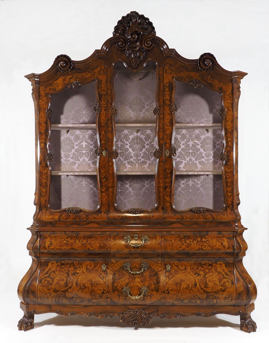 Grande credenza "olandese" doppio corpo con decori floreali, parte inferiore a 2 ante e 3 cassetti con fronte bombato, parte superiore a 2 ante vetri. cm. 258x158x58. XIX sec.